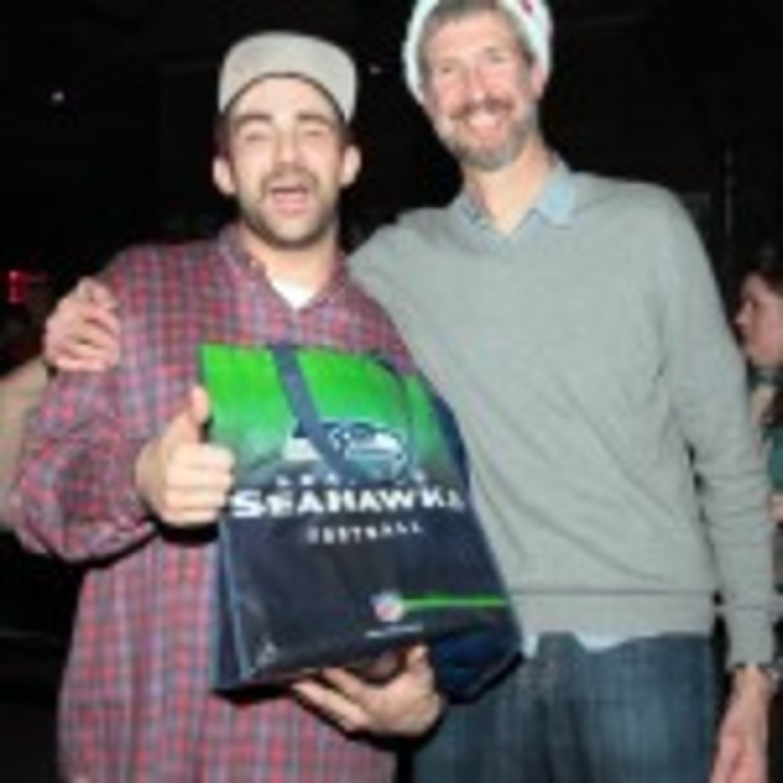 Associate Manager Rick Rogers from the Sand Point Delivery Kitchen claims his Seahawks tickets from Jeff Woodruff.