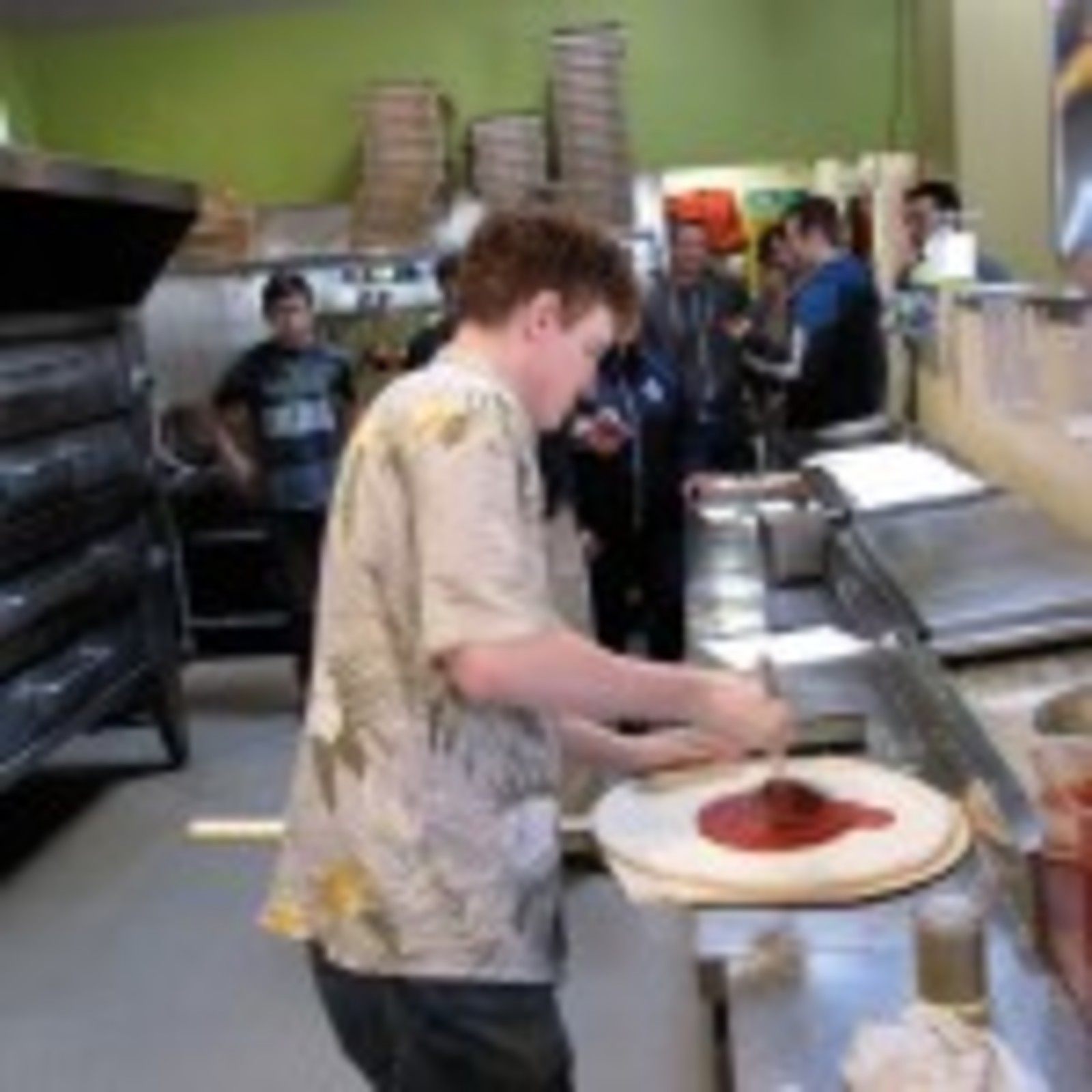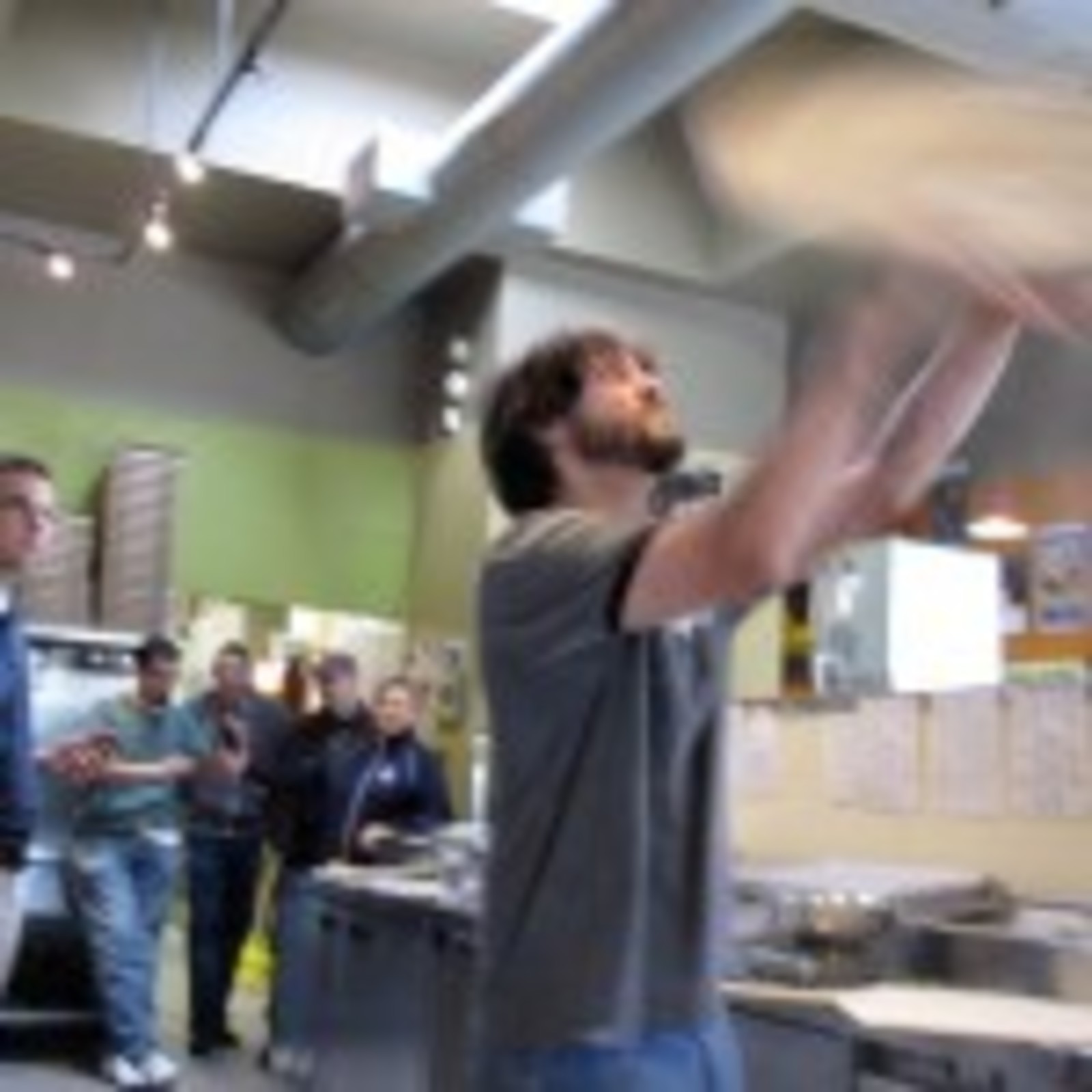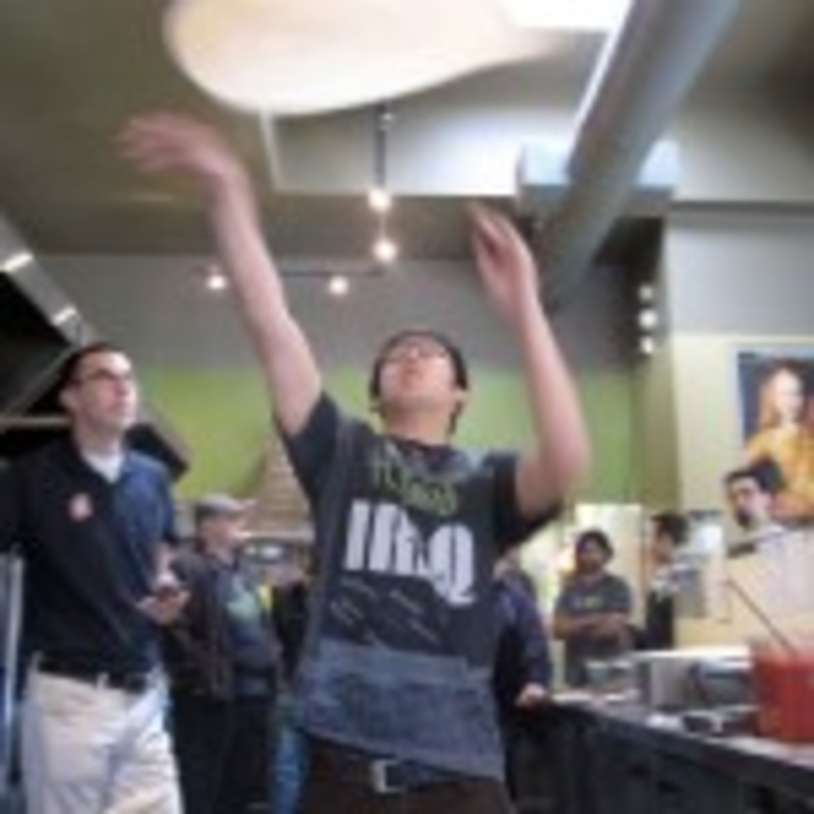 This April, 64 of Pagliacci’s best tossers tested their mettle against one another. The early rounds saw some great performances – especially in the North Bracket where Mike Baxley from 145th, Kyu Han from 85th, Brian Youngdahl from Ballinger and John Bassage from 145th put up not only the best 4 scores of their region, but the best 4 scores of the first round. Cumulative scores helped the North 4 in the Sweet 16 where they moved on to the finals – along with Josh Frost of Miller and Paul Williams of Crossroads (due to very tight scoring, the final group was expanded). The finals were held Thursday at Lake City Way. Paul Williams was the lone holdover from the finals last year and proved that having been through the gauntlet before made him more battle-tested. His nearly perfect pie went into the oven in 34 seconds and held off Kyu from 85th who took 2nd place, a mere 3 points away from the title. Tossing to “Octopus’ Garden” by the Beatles, Mike Baxley hacked his way into 3rd place. Congratulations to Paul who now owns the title of Best Cook in Pagliacci!