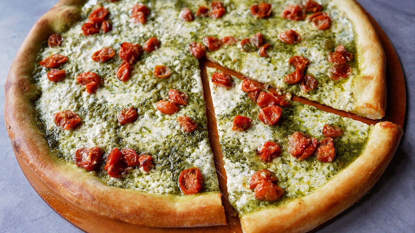 Sometimes nothing beats simple, elemental flavors in harmony. Our second seasonal, the Pesto Pomodoro pizza, is a shining example. It features roasted tomatoes and creamy, buttery burrata on a pesto base. We top it with Parmesan and finish it with sea salt.
