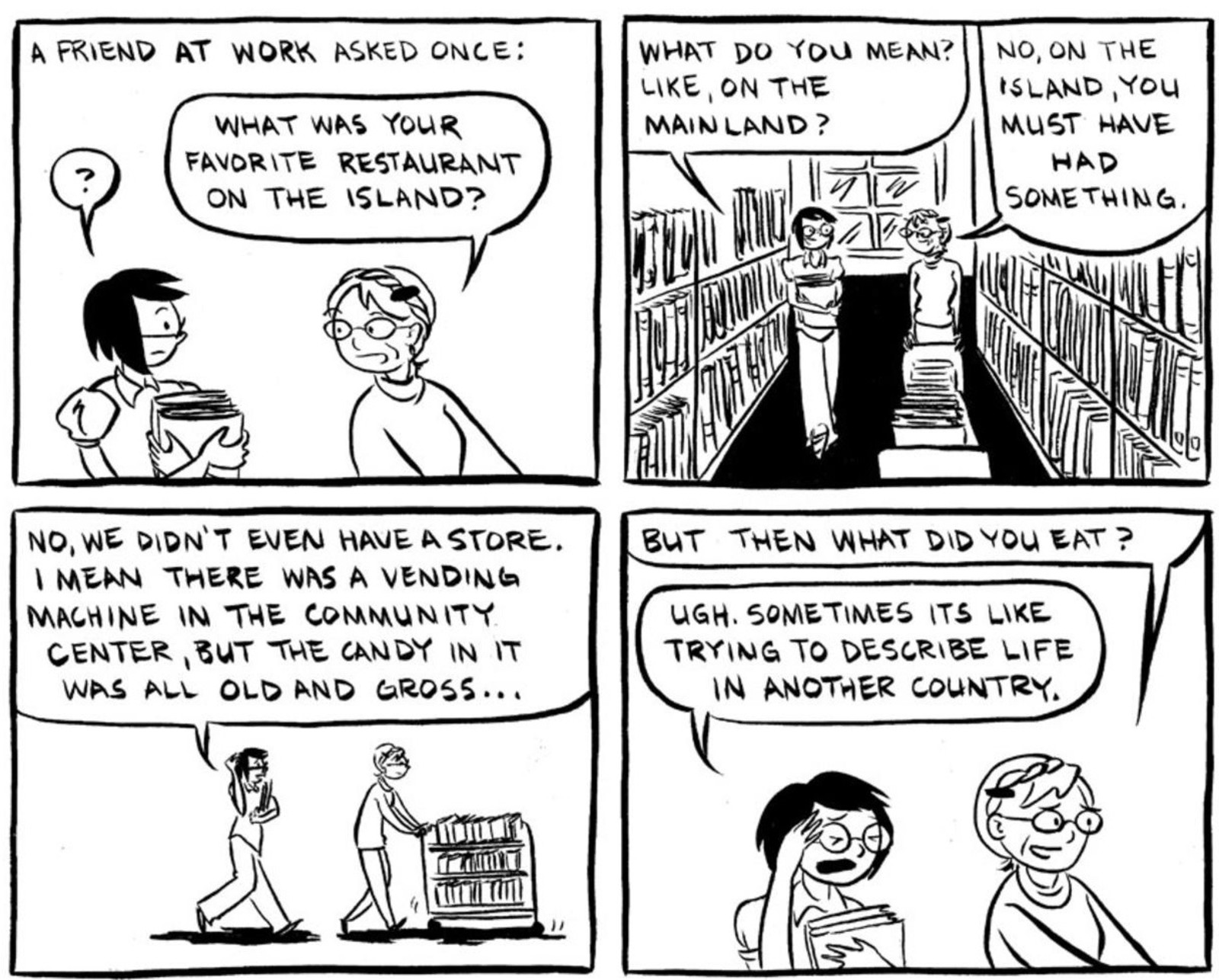 Colleen says, “I wish I could say that getting an invitation to the closing of my hometown was the weirdest things that ever happened to me, but I think that award would have to go to locking up my pool toys with a bike chain as a kid so that they couldn’t be used during an escape attempt.” In the book, she mixes her experience of returning to the island as an adult with flashbacks that allow you to feel what it was like to live there as a teenager.