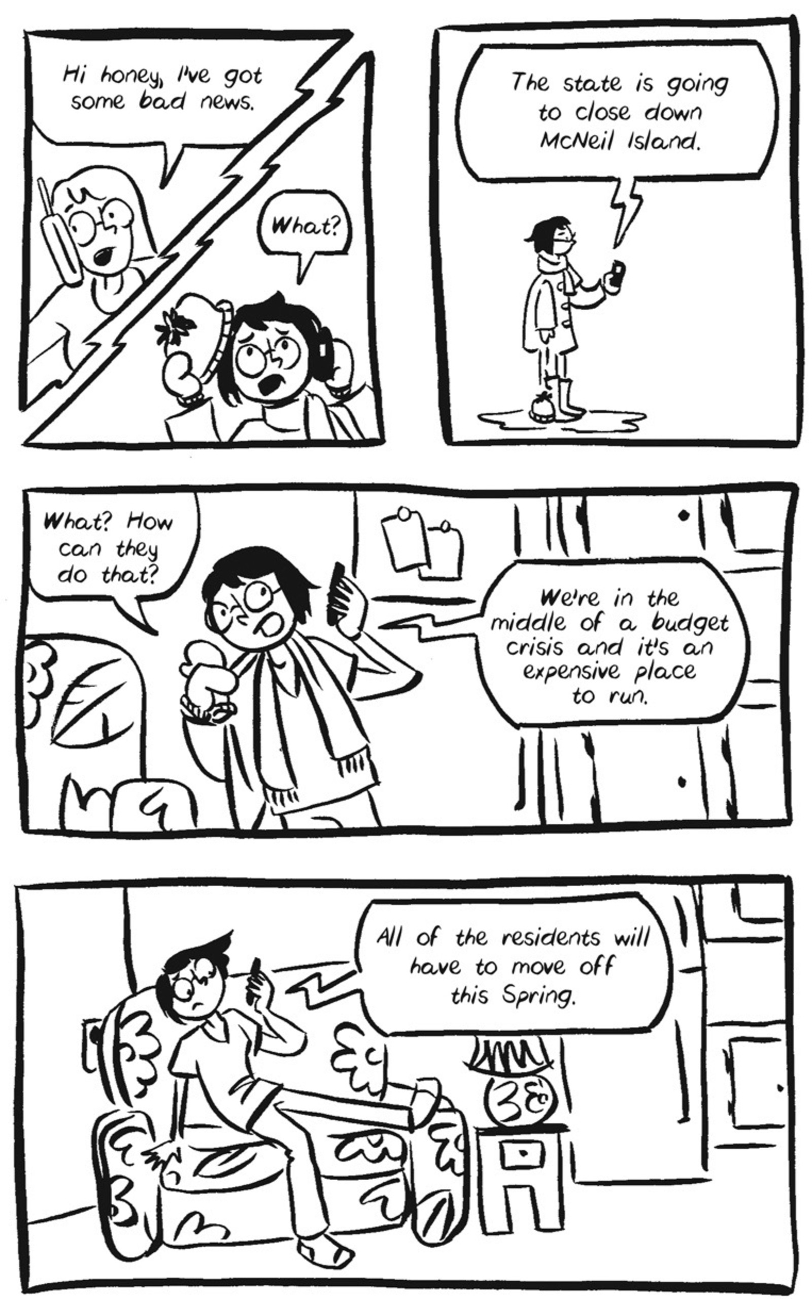 In 2011, Washington State closed down the McNeil Island Correctional Center. Running an island prison is expensive, and the facility was a victim of statewide budget cuts. Colleen received an invitation to attend the official closing ceremonies. At the time, she was living in White River Junction, Vermont where she had recently finished an MFA from The Center for Cartoon Studies. She was too broke to even think of going when a patron of the arts, Annie Koyama (also known as Kick-Ass Annie), of Koyama Press in Toronto, offered to cover travel expenses if Colleen would write about it. Eventually, Colleen turned the experience into the full-length graphic novel Prison Island.