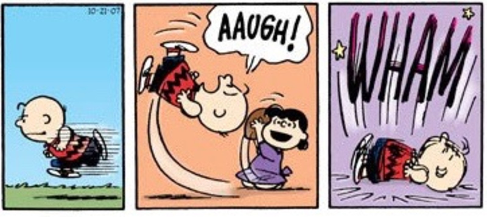 In a comic one reads pictures, rather than simply looking at them. Minds string these images together intuiting their movement, animating them both in our minds and before our eyes. Often rendered in a few quick strokes, these static images take flight as you connect the panels. When Charlie Brown is running to kick the football in one panel and lying on his back in the next with Lucy holding the football you have seen the action in your mind. Both the passage of time and the frozen moment exist simultaneously.
