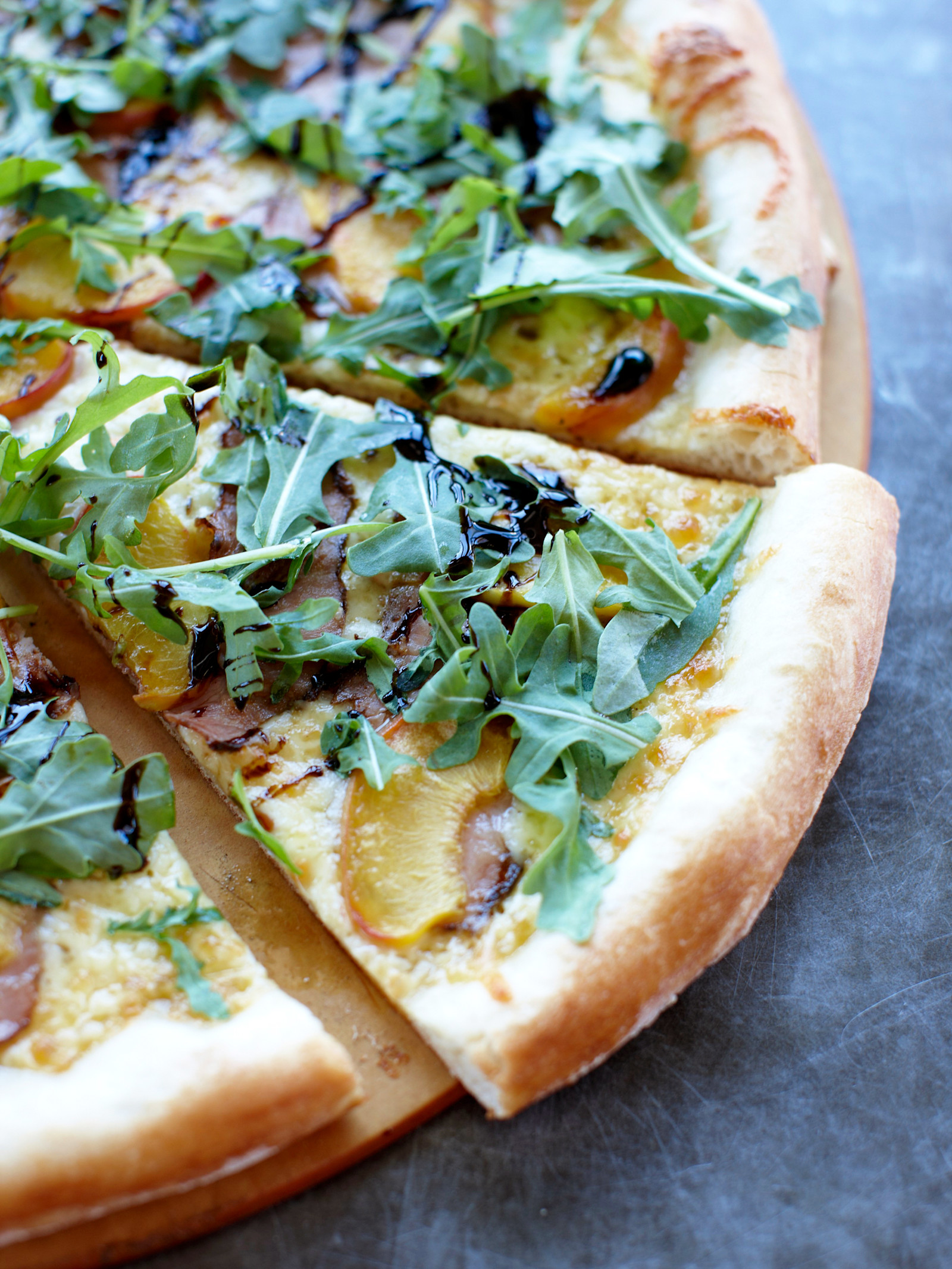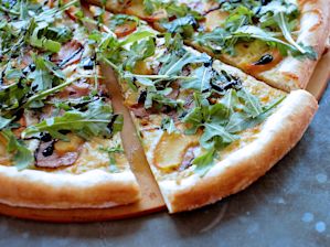 Our new seasonal pizzas showcase some fabulous local produce. Our Peachza Primo is a tribute to Washington state peaches. Peachy, tangy, juicy—it’s a riot of complementary flavors. We layer savory roasted pork loin with peaches from Eastern Washington over mozzarella and an olive oil base. Out of the oven, we top the pie with fresh peppery arugula and a tangy drizzle of balsamic reduction.