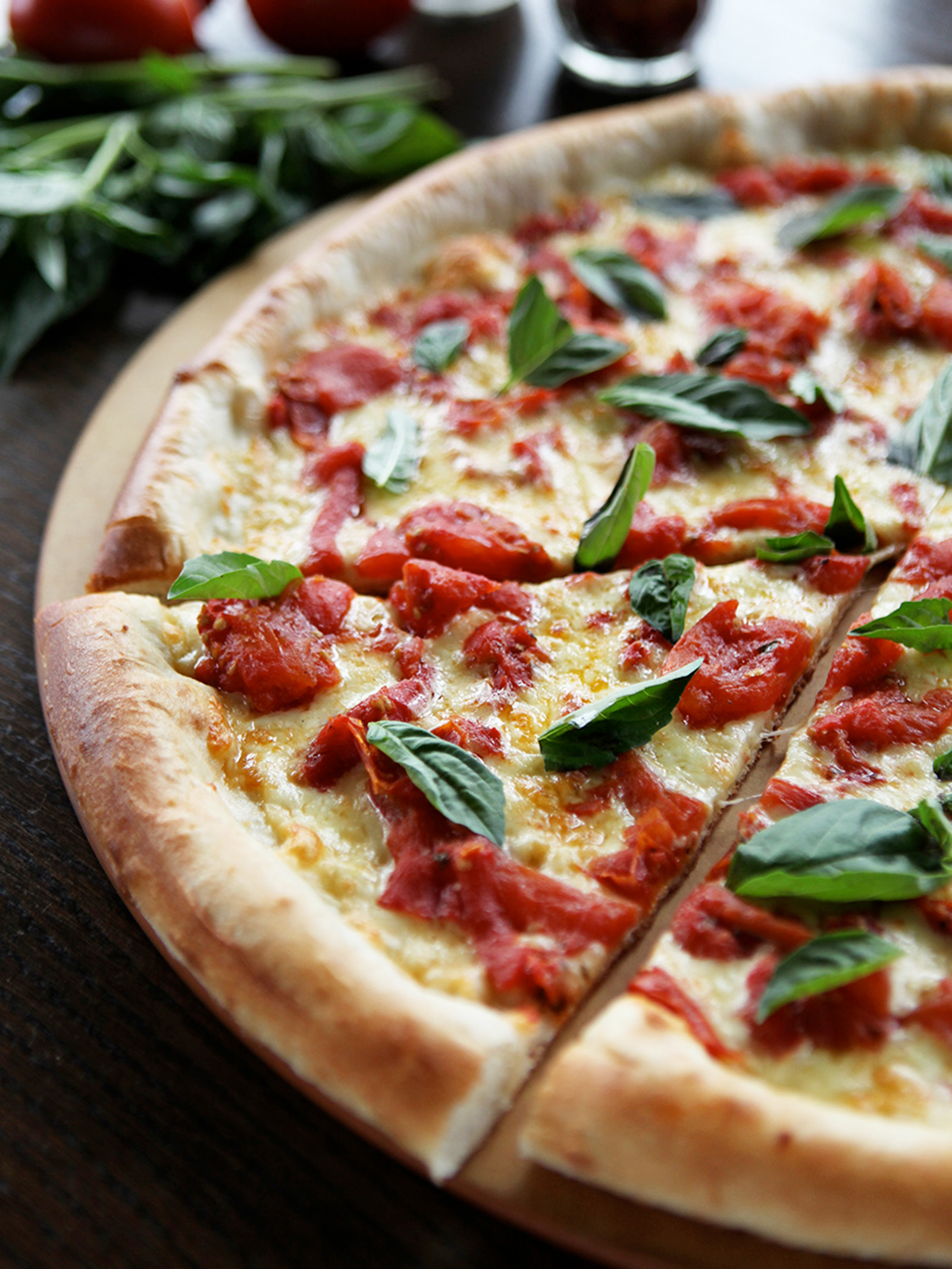 When tomatoes fill the tables at the farmers market, we use them on as many seasonals as possible. Our Tomato Basil Primo features farm-fresh tomatoes that are slow-roasted with garlic and basil. The result is a caramelized tomato with intense depths of flavor. We layer them over olive oil and mozzarella. After baking, we top the pie with fresh basil.