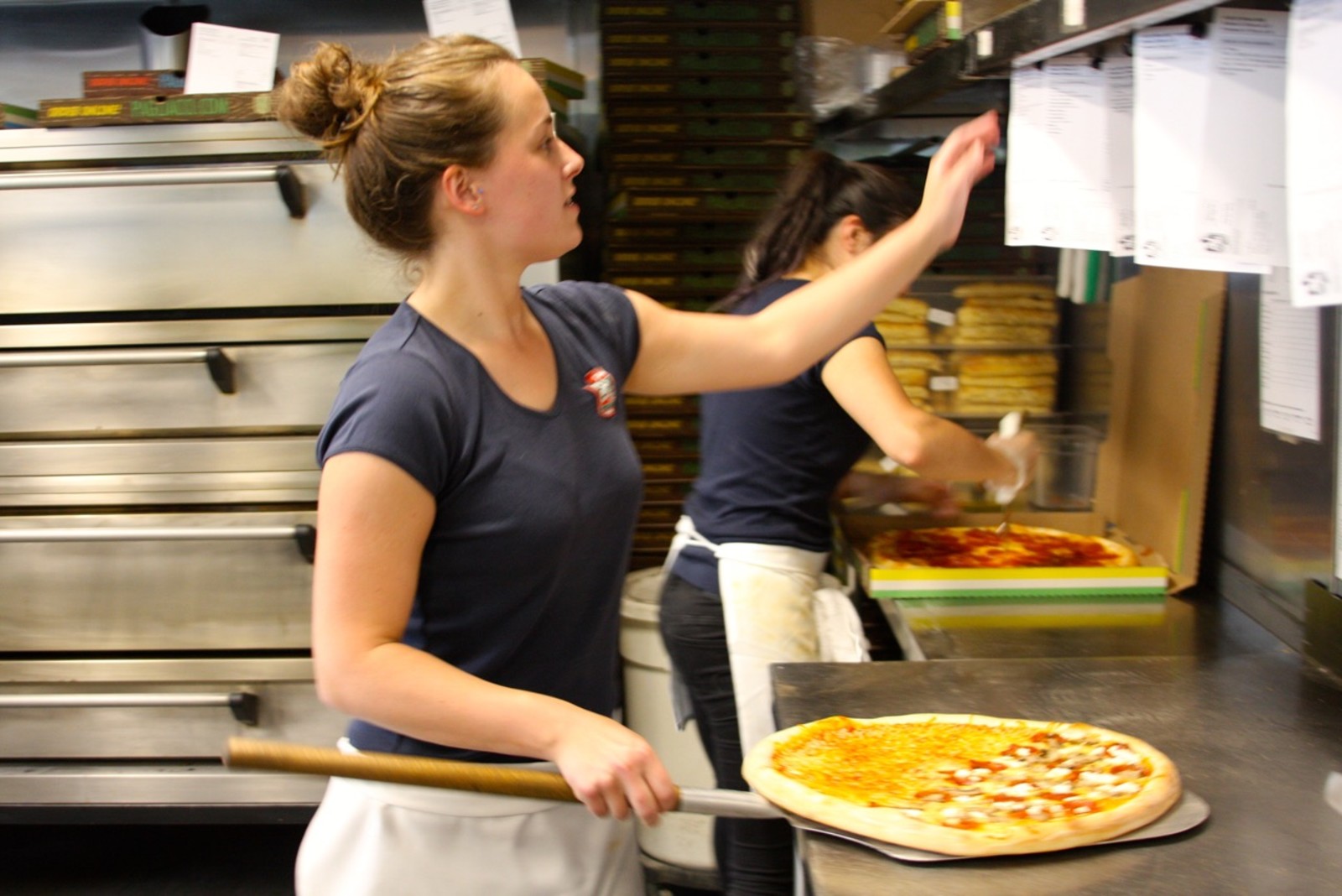 “Running ovens is my favorite spot to be in the store now. But I remember it being very intimidating when I first was learning how to pull the pizzas out of the oven,” Molly says. “It takes a certain amount of repetition to build up the strength, if that is what you want to call it. I call it my pizza arm. Once you are good at it and you find your rhythm it is the place to be. There is a lot going on all at once. You help manage quote times, cook the pizzas, cut the pizzas, make sure they are correct for the customer and route them for the driver.”