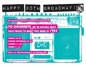 We opened our Broadway Pizzeria on Capitol Hill 30 years ago. To celebrate, on Saturday we are rolling back prices to what they were in 1983.