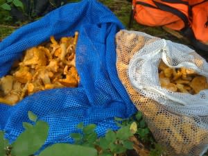 Now, I was ready to fill my bag. However, we had to wait to get direction from Steve. First was the safety tip. “Only get the chanterelles. While there are plenty of other tasty mushrooms out here, you are beginners and could get very sick.” He also warned us of what to look for in a chanterelle (a branch in the veins on the underside of the mushroom cap), because there is a similar looking mushroom that can make you sick. Next, we had to learn etiquette. “Never pull the mushroom out of the ground. Use your knife and make a clean cut.” Another courtesy tip, “stay on the path as much as you can to protect the wildlife and don’t litter.” Before I could get my backpack on, Steve was up the trail gathering his first mushroom. I set off with Michelle, not entirely sure what to look for, but before long she pointed one out to me. Soon I was souring the hillside for the golden domes, making careful cuts and filling my bag.