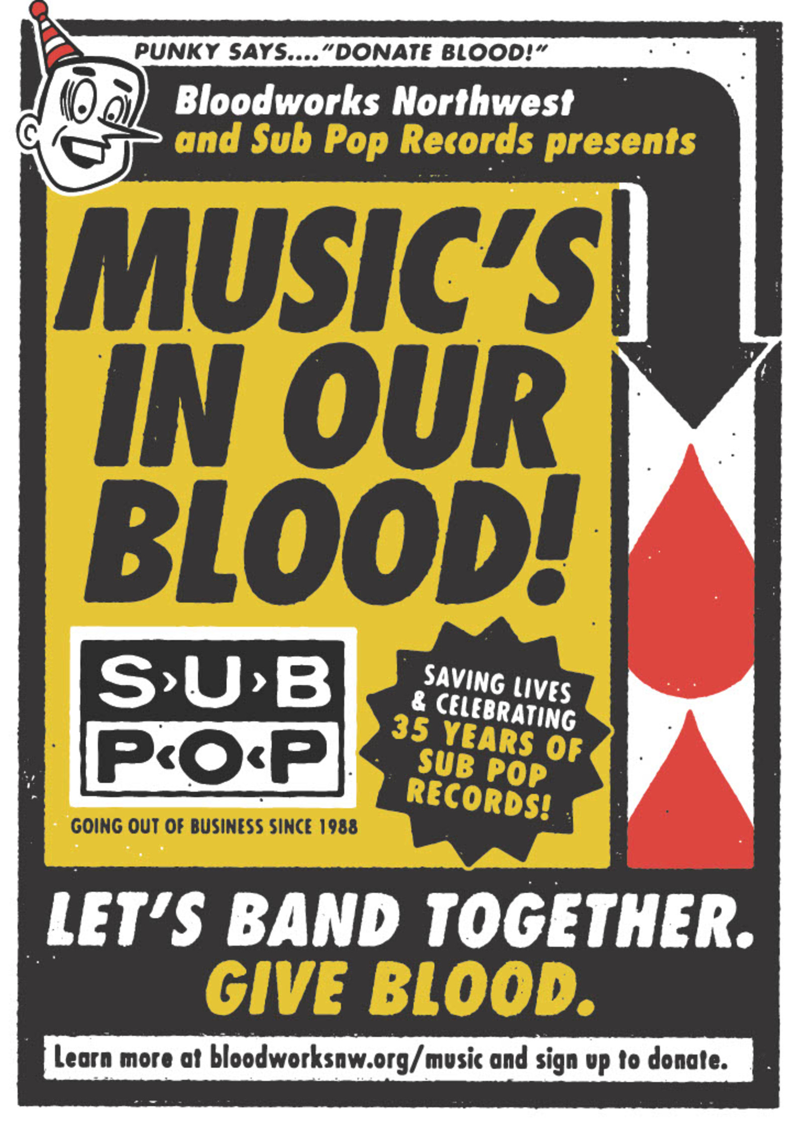 Pagliacci, KEXP, Sub Pop, Three Magnets Brewing Co., and others team up with Bloodworks Northwest to promote the critical need for blood donors in the region.