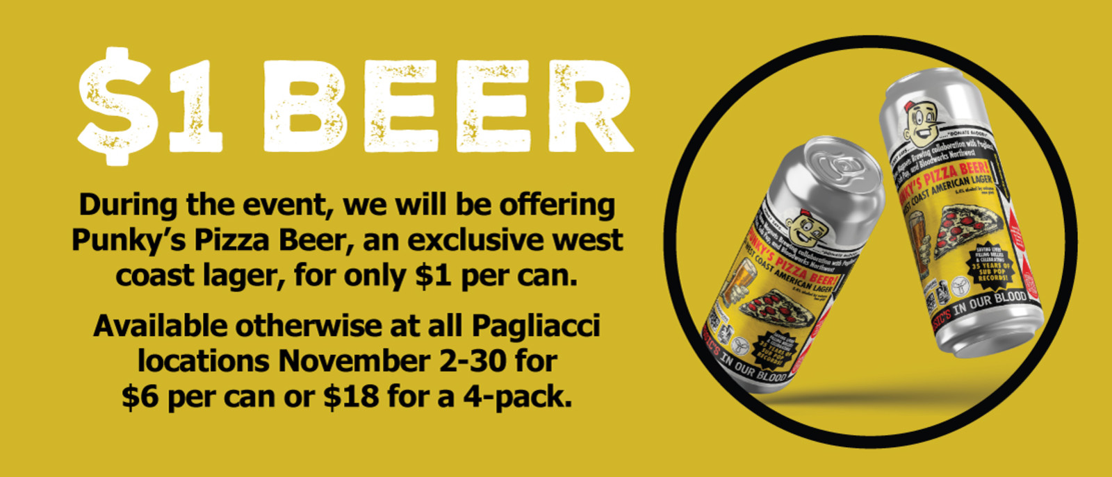 Bloodworks Northwest will be on hand hosting a table with information about the campaign and how to register to donate blood. The new beer, Punky’s Pizza Beer, has been exclusively crafted by Olympia’s Three Magnets Brewing Co. in partnership with Pagliacci and Sub Pop Records. Following the event, you can order this West Coast American Lager in 4-packs of 16 oz. cans through Pagliacci during the month of November.