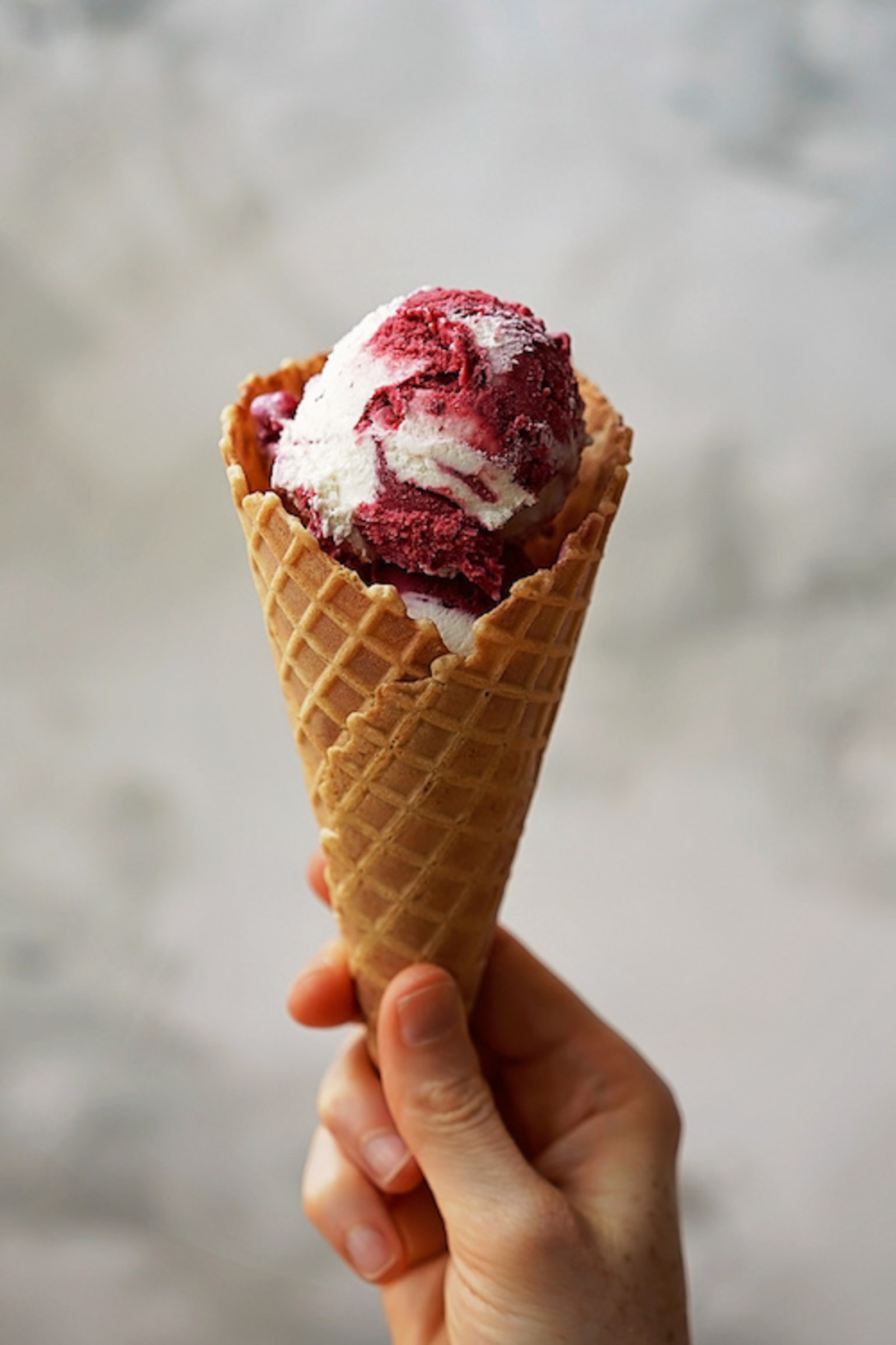 And for dessert, our seasonal gelato is Marionberry Vanilla Swirl. In August and early September, along the sides of roads and fields, marionberries are ripe for the picking throughout the Pacific Northwest. Gelatiamo purchases baskets of handpicked, juicy berries from a farm in Oregon for their Marionberry Gelato. This bright, lively gelato is then swirled with a custardy gelato loaded with rich vanilla bean flavor. The result is a silky smooth blend of sweet cream and tart berries.
