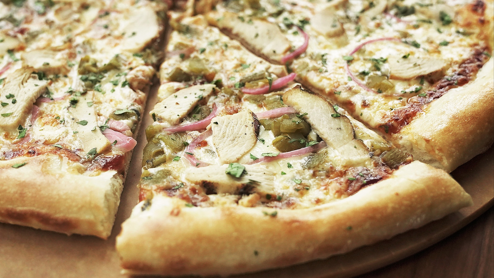 Although we prioritize using locally sourced products, we occasionally make exceptions. Our seasonal BBQ Chicken Primo pays homage to New Mexican cuisine, inspired by John Clifford, our Senior Director of Training and Development, who grew up in New Mexico. Hatch chiles, the defining ingredient of New Mexican cuisine, lend their smoky flavor and medium spice to this pizza, which also features chicken, pickled red onions, mozzarella, and barbecue sauce. We finish the pie with a sprinkle of fresh cilantro.