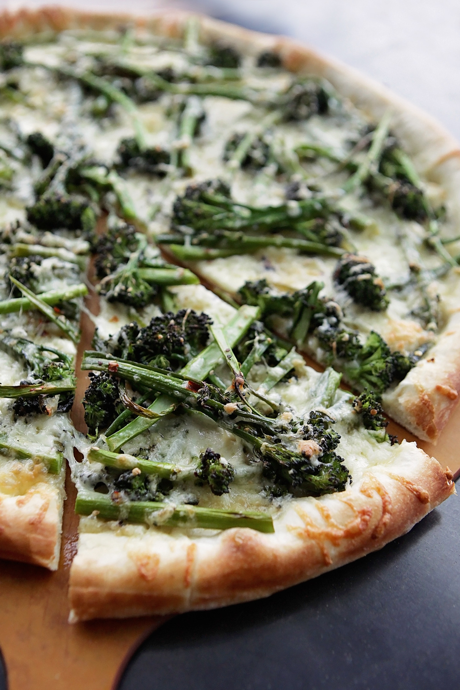 East meets West in this seasonal vegetarian pizza. It stars broccoli's tall, skinny cousin, broccolini. We love its tender stalks and mild, sweet taste. We roast the broccolini with a mix of sesame seeds, sesame oil, sea salt and a dash of chili flakes. Then we drape the roasted broccolini over a delicate blend of mozzarella and fontina over an olive oil and minced garlic base. Eating your vegetables is rarely this delicious.