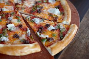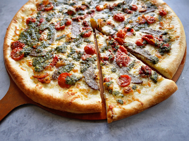 First up is our Matador Primo, featuring ‘nduja, a regional specialty of Calabria (the "toe" of southern Italy). The spicy spreadable sausage is a cultural byproduct of the 19th-century battles between the French and the Spanish. Made with pork, herbs, spices and Calabrian peppers, ‘nduja has a distinctive red color. Our Matador Primo features ‘nduja, buttery Castelvetrano olives, creamy fresh mozzarella and tangy Manchego cheese over crushed Italian tomatoes.