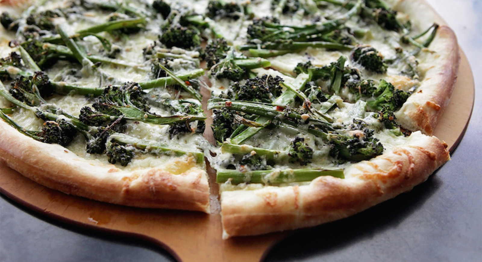 Our second seasonal is the Broccolini. A hybrid of broccoli and Chinese kale, broccolini looks like broccoli’s tall, skinny cousin. Roasted, its tender stalks have a mild, sweet flavor. We toss it with a mix of sesame seeds, sesame oil, sea salt and a dash of chili flakes. Then we drape the roasted broccolini on a delicate blend of mozzarella and fontina over an olive oil and minced garlic base.