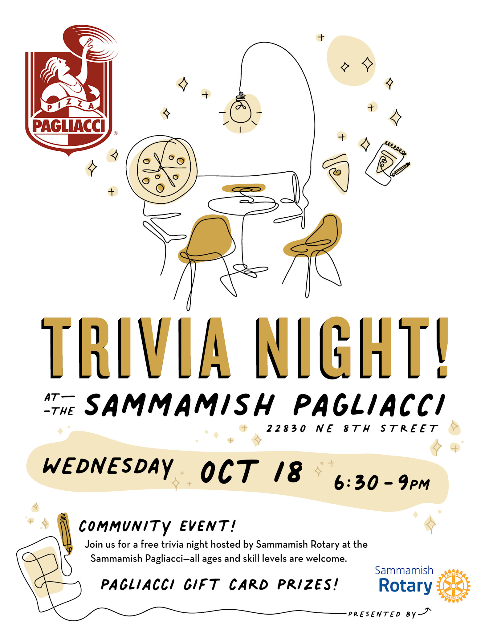 Mark your calendars! On Wednesday, October 18, from 6:30 p.m. to 9 p.m., Pagliacci in Sammamish will be the arena for a trivia showdown, brought to you by the Rotary Club of Sammamish. They’ll provide the fun, paper, and pencils — all you need is your knowledge and your game face.