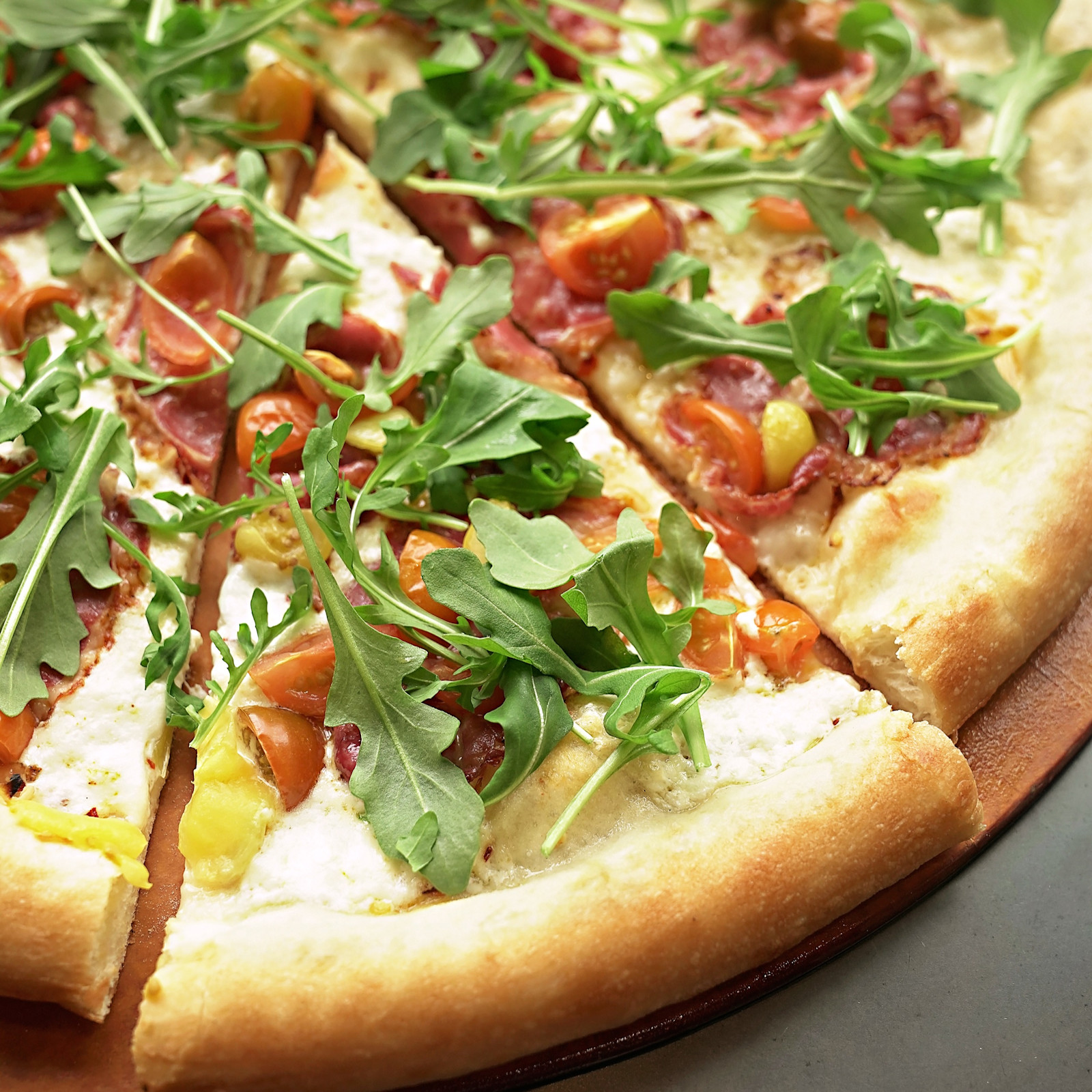 We found the inspiration for our newest pizza on a trip to Maui. An extraordinary pizza at Restaurant Marlow in Pukalani sent us over the moon. The pizza’s beauty was in its simplicity — a handful of excellent ingredients in just the right proportion and perfectly cooked. Marlow chef and co-owner, Jeff Scheer, sources many of his ingredients locally from farmers, and ranchers from whom they get whole market hogs to make their own specialty meats, such as the coppa on our favorite pizza. Marlow’s approach to quality, service and community is near and dear to our hearts. Our tribute, The Marlow Primo, features coppa, creamy burrata, and cherry tomatoes on an olive oil base sprinkled with chili flakes. We top the baked pie with fresh arugula.