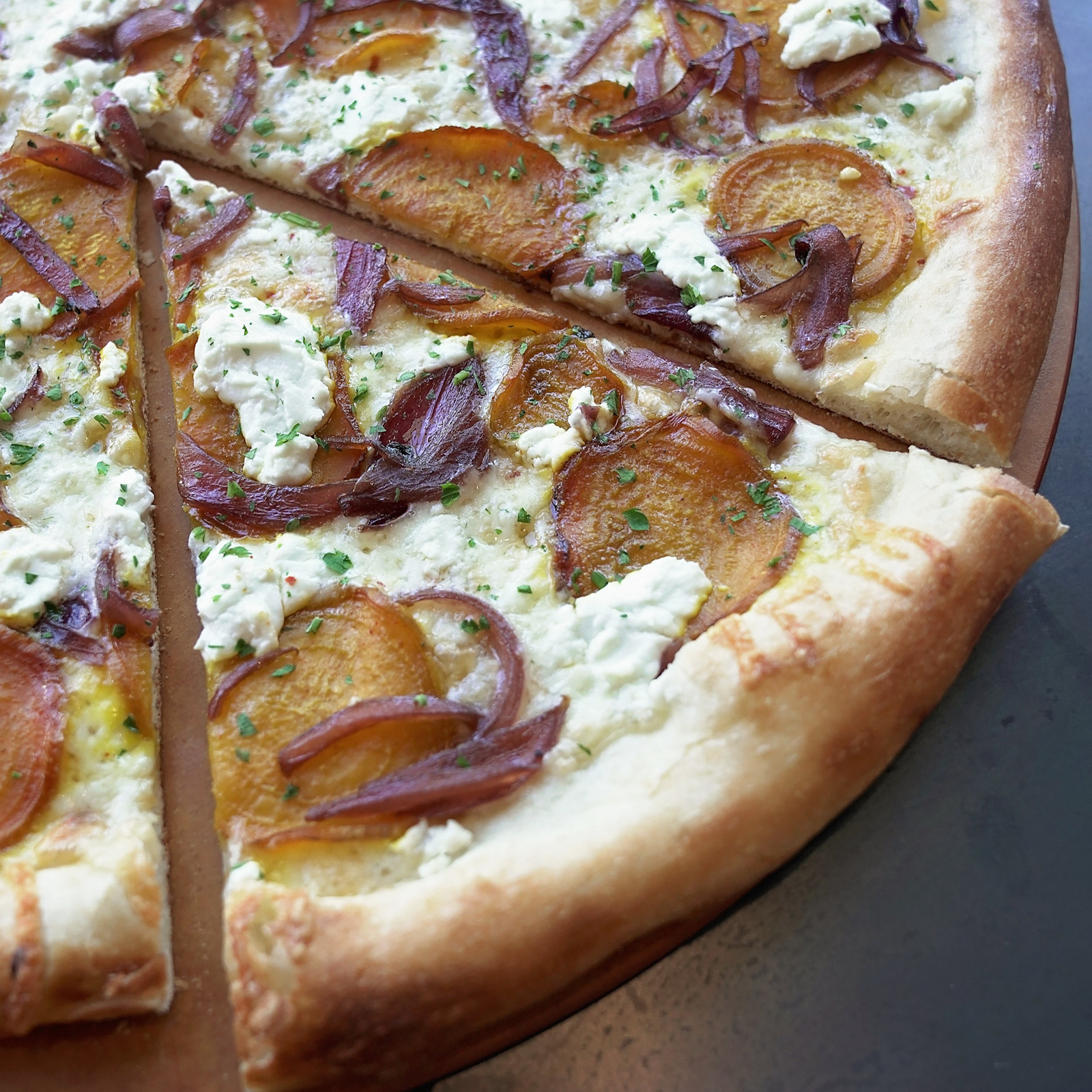 Roasted golden beets—sweet, earthy and tender—are the star of The Beet Pizza. This innovative new pizza created by our very own Mikael Croy features sliced golden beets roasted in cumin and smoked paprika with red onions caramelized in balsamic vinegar, creamy goat cheese, and a combo of mozzarella and fontina over an olive oil base. Red chili flakes add a touch of heat, and a sprinkling of fresh parsley finishes it off.
