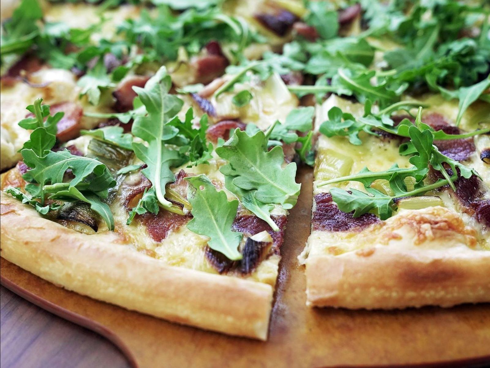 Our second seasonal pizza, Bacon Leek Primo, showcases Pike Place Market’s Beecher’s Flagship, made by Beecher’s Handmade Cheese (another Seattle spot with an ever-present line). The assertive, sharp cheddar with a gentle sweetness melts beautifully, making it a great pizza cheese. Our Bacon Leek Primo combines the award-winning cheese with crisp bacon, mozzarella, and earthy, roasted leeks. After baking, we top the pie with fresh peppery arugula.