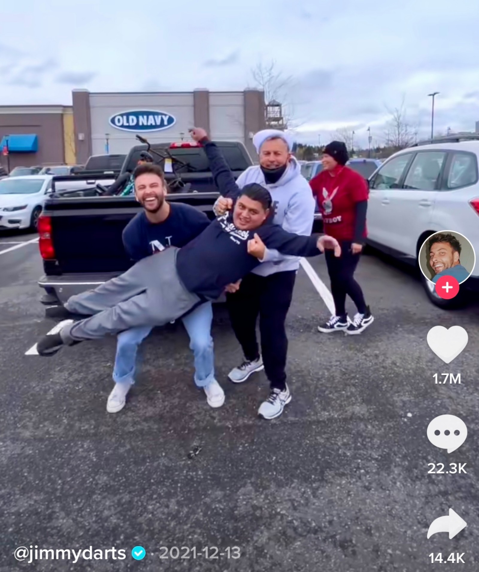 Darts managed to get the initial footage with an iPhone carefully placed in the front pocket of his t-shirt. Once Darts revealed he was a TikTokker, three other guys with cameras came out from around the corner.