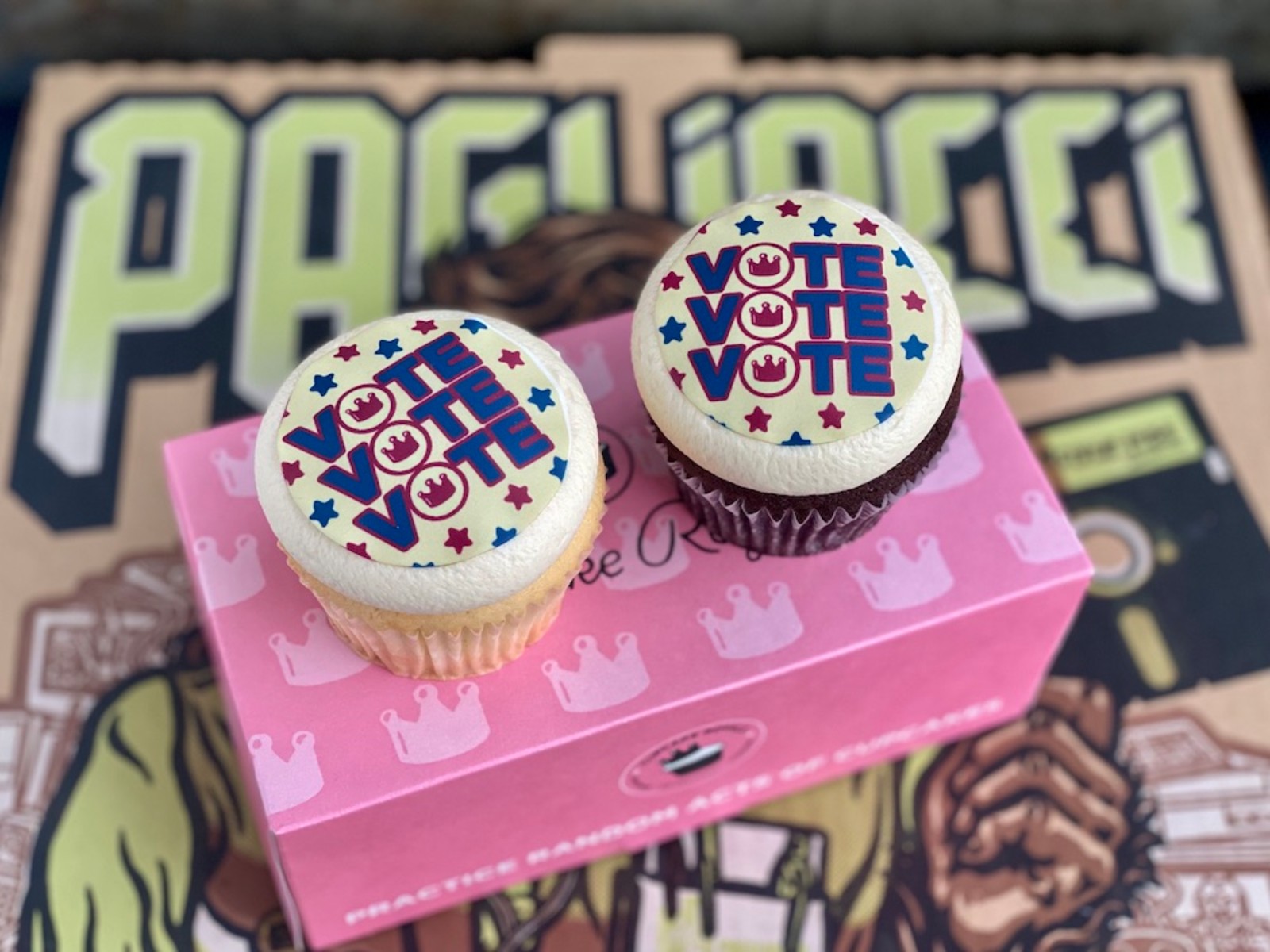 VOTE Cupcake Giveaway Monday 11/2We're teaming up with Cupcake Royale to bring you vote themed cupcakes on the eve of the election. We'll include a 2-pack of VOTE VOTE VOTE! cupcakes with all orders of a whole pie, while supplies last!