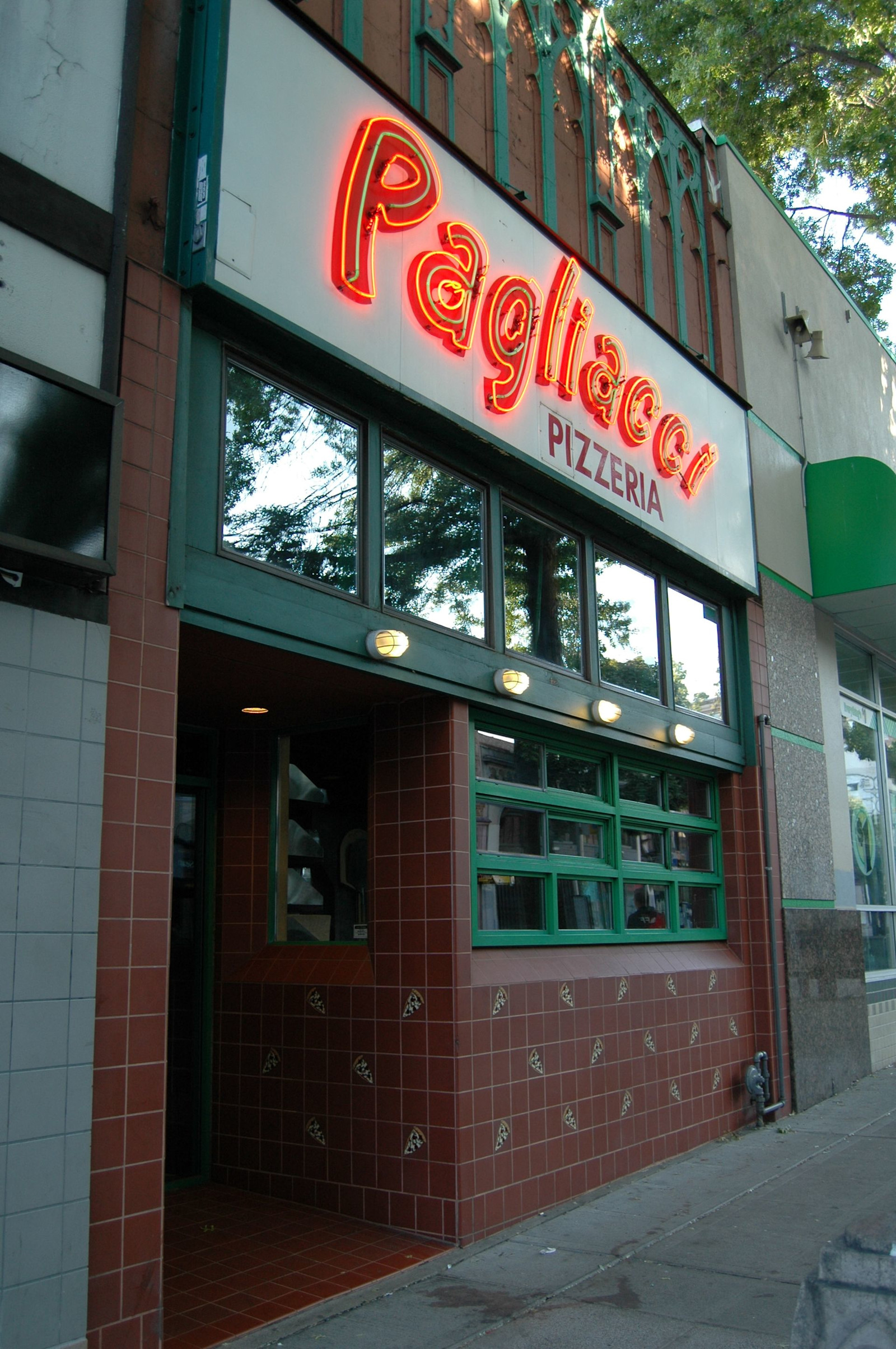 The original Pagliacci Pizza, located on The Ave in Seattle’s University District, opened in 1979. Dorene Centioli-McTigue, the owner, dreamed of a neon sign, but first opted for a hand-painted one. She wanted to be sure the place would be around long enough to justify the expense of a custom neon sign.