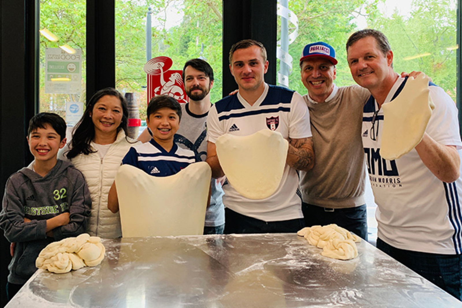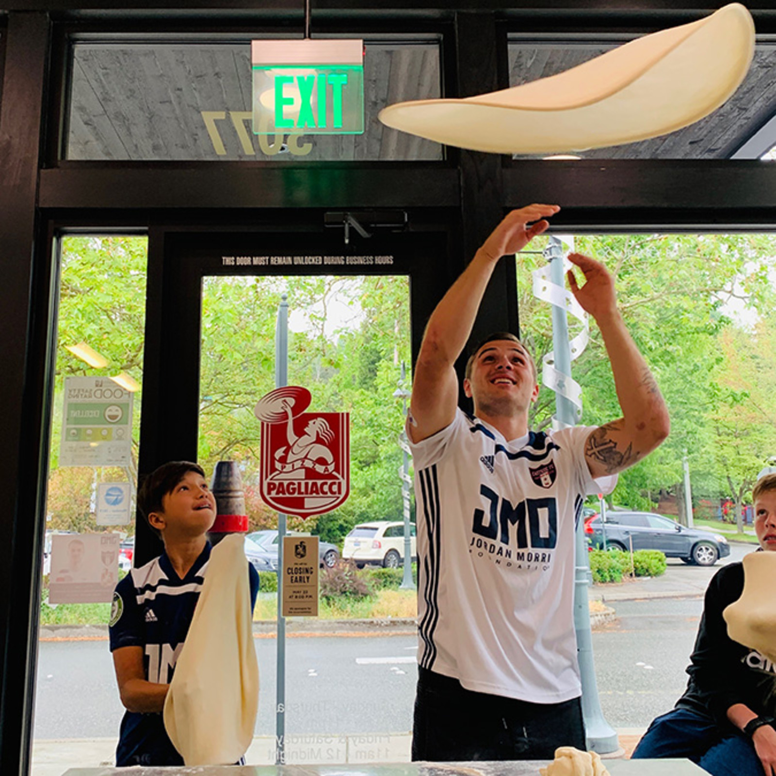 Never meet your heroes, or so the expression goes. Well, we got to meet one of ours, and we’re only too glad we did. Jordan Morris, a star forward for the Seattle Sounders, stopped our Mercer Island store for an event supporting the Jordan Morris Foundation. We taught him to toss pizza the Pagliacci way, he autographed jerseys and more, everyone had fun eating and drinking, and we signed a BIG check.