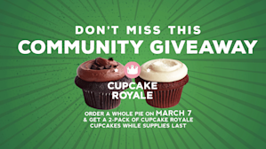 Order a whole pie on Tuesday, March 7, and we’ll treat you to a two-pack featuring Cupcake Royale’s most popular cupcakes: Red Velvet and Triple Threat (chocolate with chocolate frosting)!
