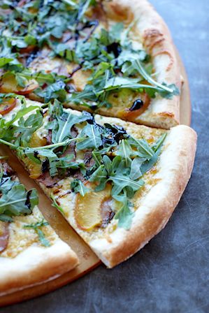 This fun pizza is all about the joy of summer abundance. We layer the sliced ripe peaches with savory roasted pork loin over mozzarella on an olive oil base. Out of the oven we top the pie with fresh peppery arugula and a drizzle of balsamic reduction, which lends balance to the sweet peaches.