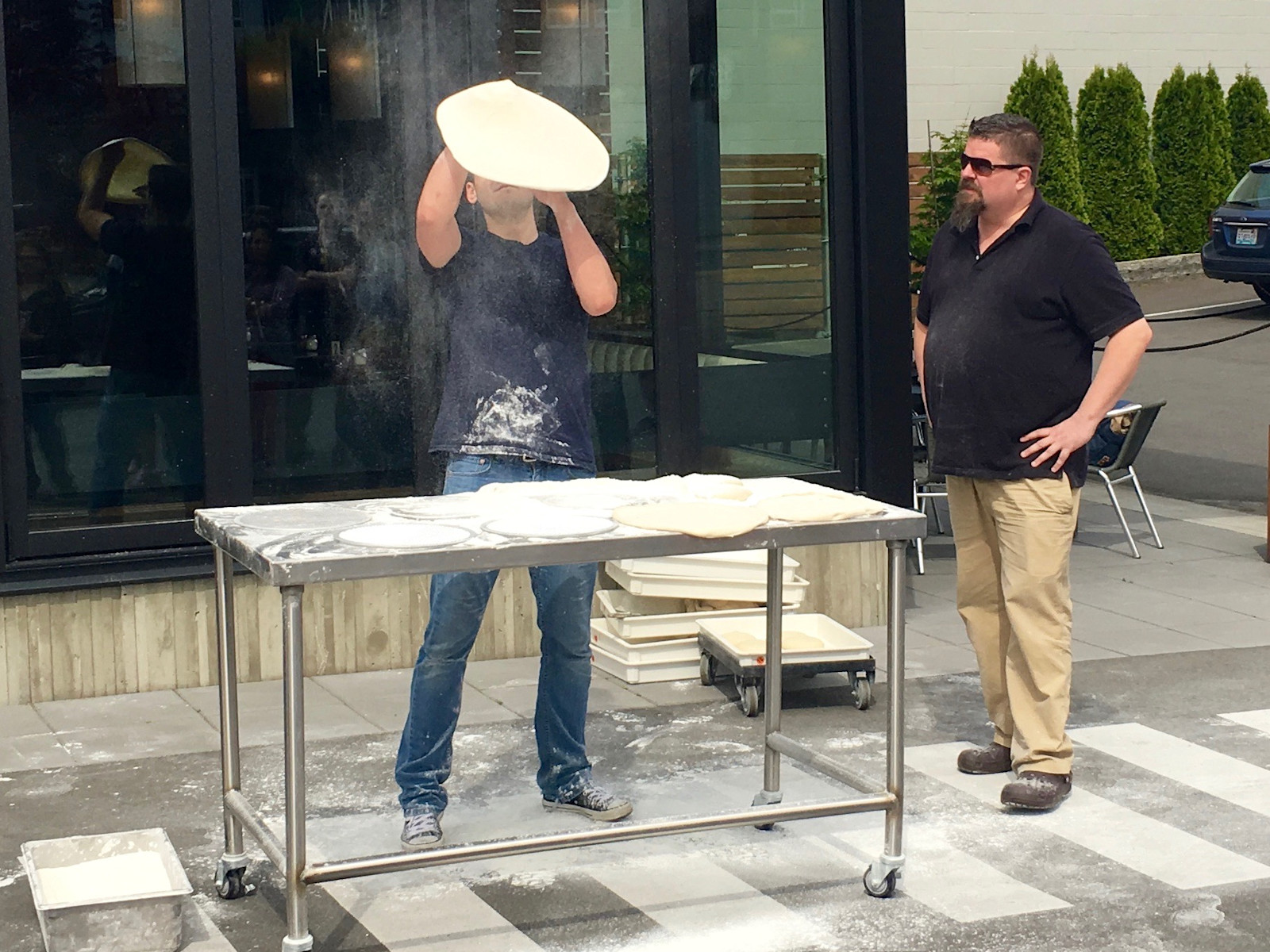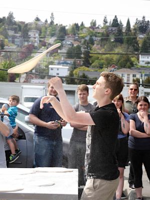 Each of Pagliacci’s stores nominated one contestant. The first three rounds, taking place over the first two weeks of April, reduced the field from 21 to 5. Finals were held at the Magnolia store on April 16th at 2 p.m. As the hour of competition neared, a large crowd stood in a semi-circle around a five-foot steel table covered with flour and five 12-inch pizza pans. Jeff Maneval placed five dough balls on the edge of the table. The first contestant took a wide-footed stance. Go! Fluttering hands worked the dough into a floured disc before tossing it into the air, flour streaming from its edge. Soon all five pans appeared to be covered. But Jeff leaned in and pointed out a pan edge that showed, a small dough hole in another. “Done,” he finally said after repairs were made. 58 seconds had elapsed. Each new contestant brought a different flare and varying strategies. Some stacked dough balls, flattening two at a time. The final competitor, James Armstrong, of the Edmonds store, had to beat a leading time of 41.45 seconds. He nailed it in 38 seconds flat, taking the honor, which this year meant a cash prize and choice Sounders tickets. Next year, if he can repeat, he will head to Vegas for a chance to win the national competition and head to Italy.