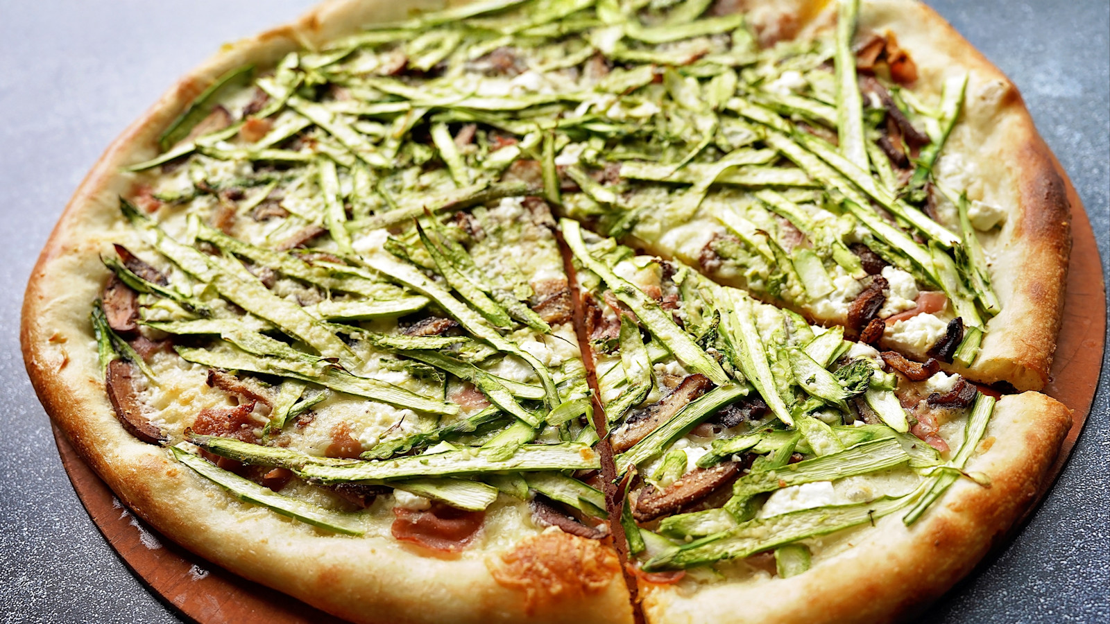 Our other seasonal this period was the pizza that launched our tradition of rotating seasonals. That was way back in 1993. The Asparagus Prosciutto Primo has made the cut every year for nearly 30 years. Warm spring days, cool nights and the mineral-rich volcanic soil in Eastern Washington make our state the nation’s largest asparagus producer. We roast tender local asparagus and layer it with prosciutto, Taleggio—a mild cheese with a fruity tang—and mozzarella over an olive oil base.