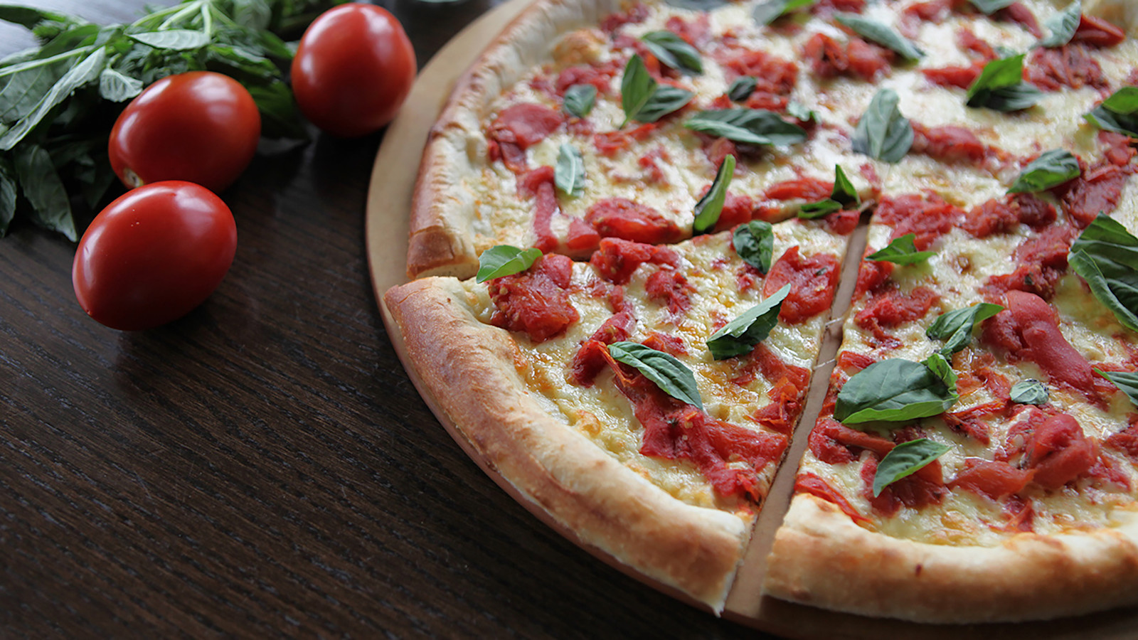 The Tomato Basil features farm-fresh tomatoes that we slow roast with balsamic, vinegar, garlic and basil. The result is a caramelized tomato with intense depths of flavor. We layer them over olive oil and mozzarella. After baking, we top the pie with fresh basil.
