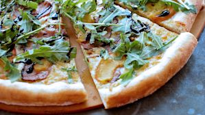 Our Peachza Primo has the perfect balance of flavors—peachy, tangy, delicious. Our tribute to Washington state peaches features savory roasted pork loin layered with juicy peaches from Eastern Washington over mozzarella and an olive oil base. Out of the oven, we top the pie with fresh peppery arugula and a tangy drizzle of balsamic reduction.