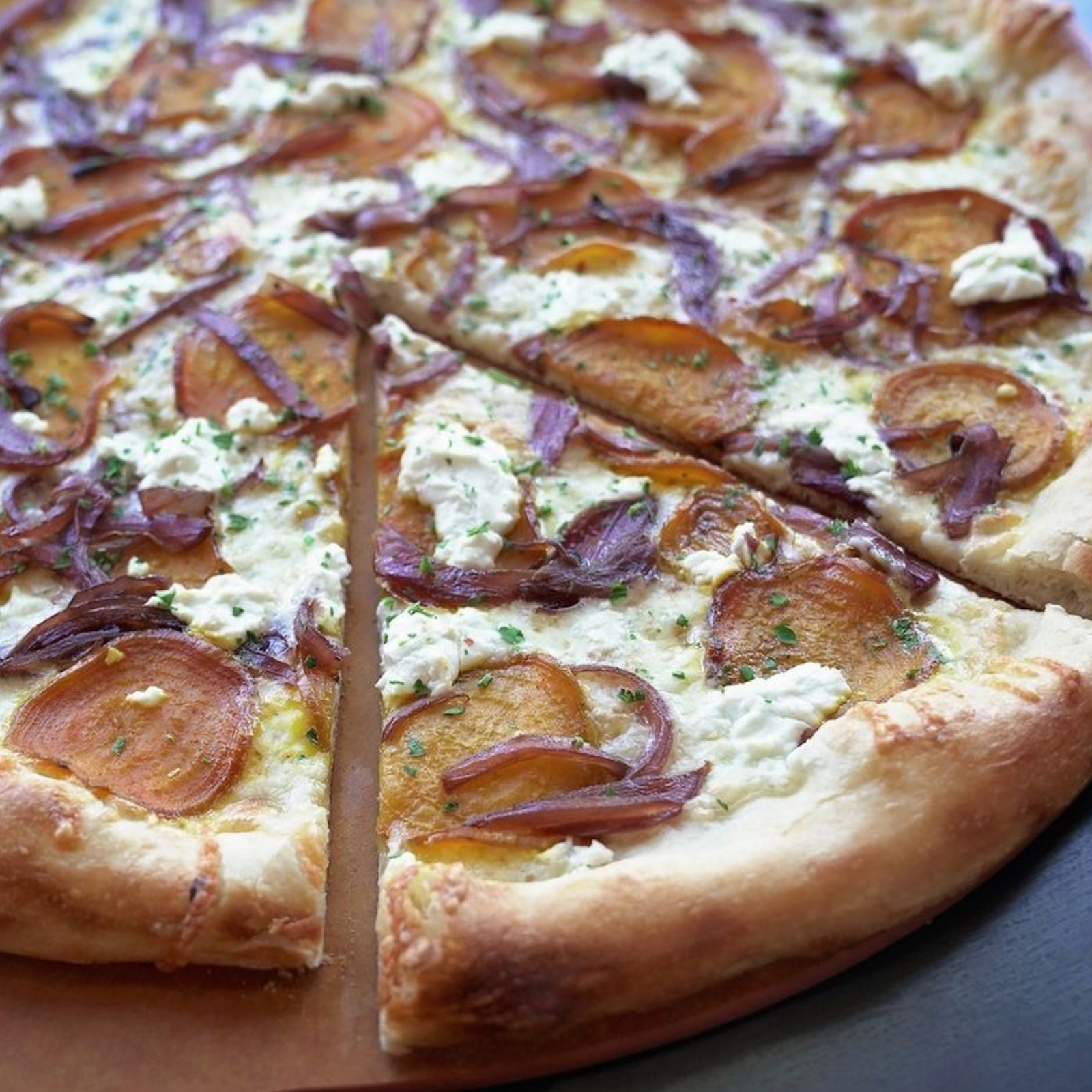For those who crave something a bit different, The Beet Pizza is an innovative treat. Roasted golden beets — sweet, earthy, and tender — take center stage. Red onions, caramelized in balsamic vinegar, and creamy goat cheese complement the sliced beets over a combo of mozzarella and fontina on an olive oil base. Red chili flakes add a touch of heat, and a sprinkling of fresh parsley tops it off.