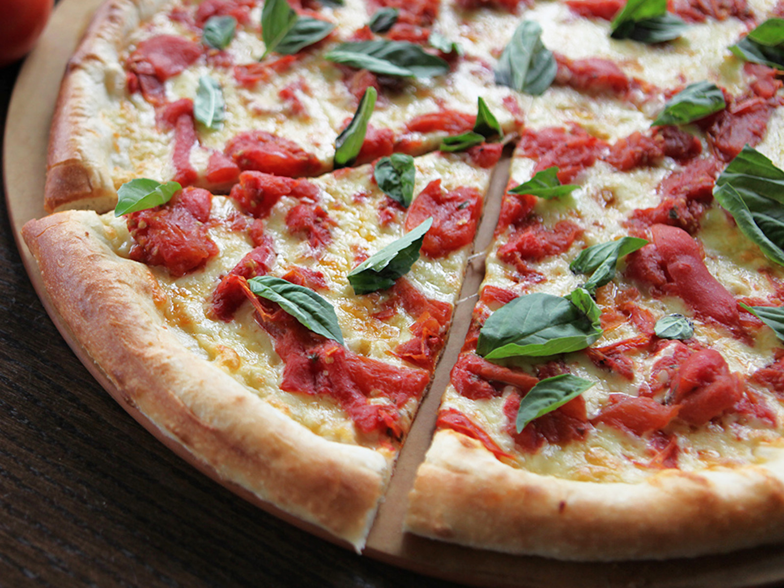Our second seasonal is Tomato Basil. What is it about tomatoes and basil that makes them harmonize so well together on the palate? Italians have been pairing them since the 19th century. There’s just something about the bright, fruity acids of tomatoes that complements the sweet, peppery fragrance of basil. Our Tomato Basil seasonal features tomatoes slow roasted with balsamic vinegar, garlic and basil. We layer the intensely flavored caramelized tomatoes over mozzarella and a roasted garlic oil base. After baking, we top the pie with fresh basil.