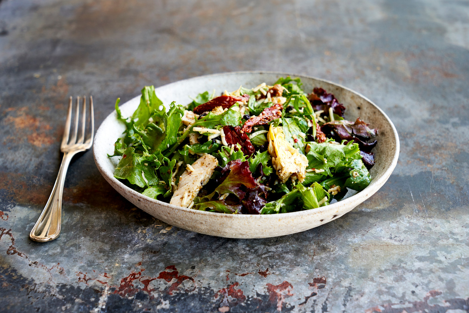 Our Sicilian Chicken, the newest salad on the roster, was born from an idea provided by a creative crew member who’d dressed a salad with our spicy chicken marinade and loved it. Our food team took the cue and collaborated with Macrina Bakery'sfounder and chef extraordinaire Leslie Mackie to create the salad on our menu today. Our marinated chicken, which has a refreshing kick of heat, gets tossed with mixed greens and arugula, thyme-roasted artichoke hearts, currants, sun-ripened tomatoes, Ferndale Farmstead’s kasseri cheese, and a house-made spicy vinaigrette inspired by our crew member’s happy discovery. Currants bring that Sicilian sweet-savory flavor, and mild, buttery chunks of kasseri cheese tame the spice.
