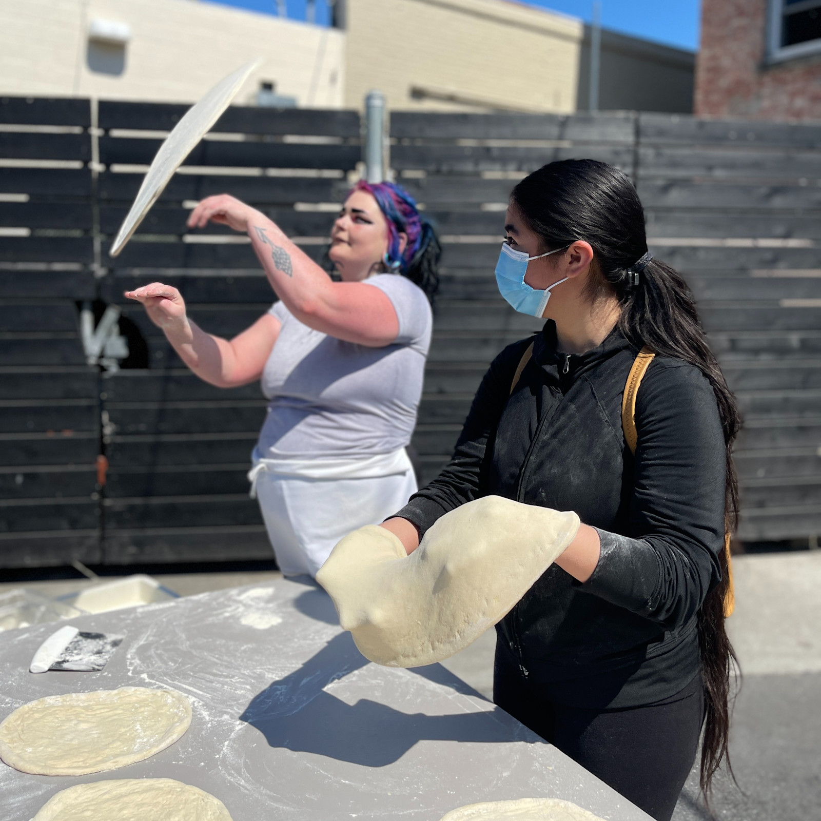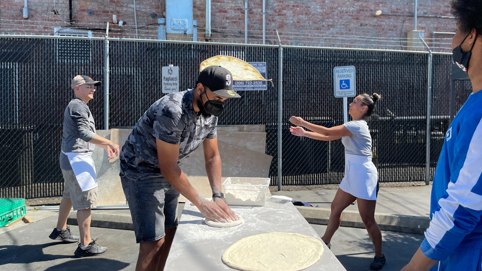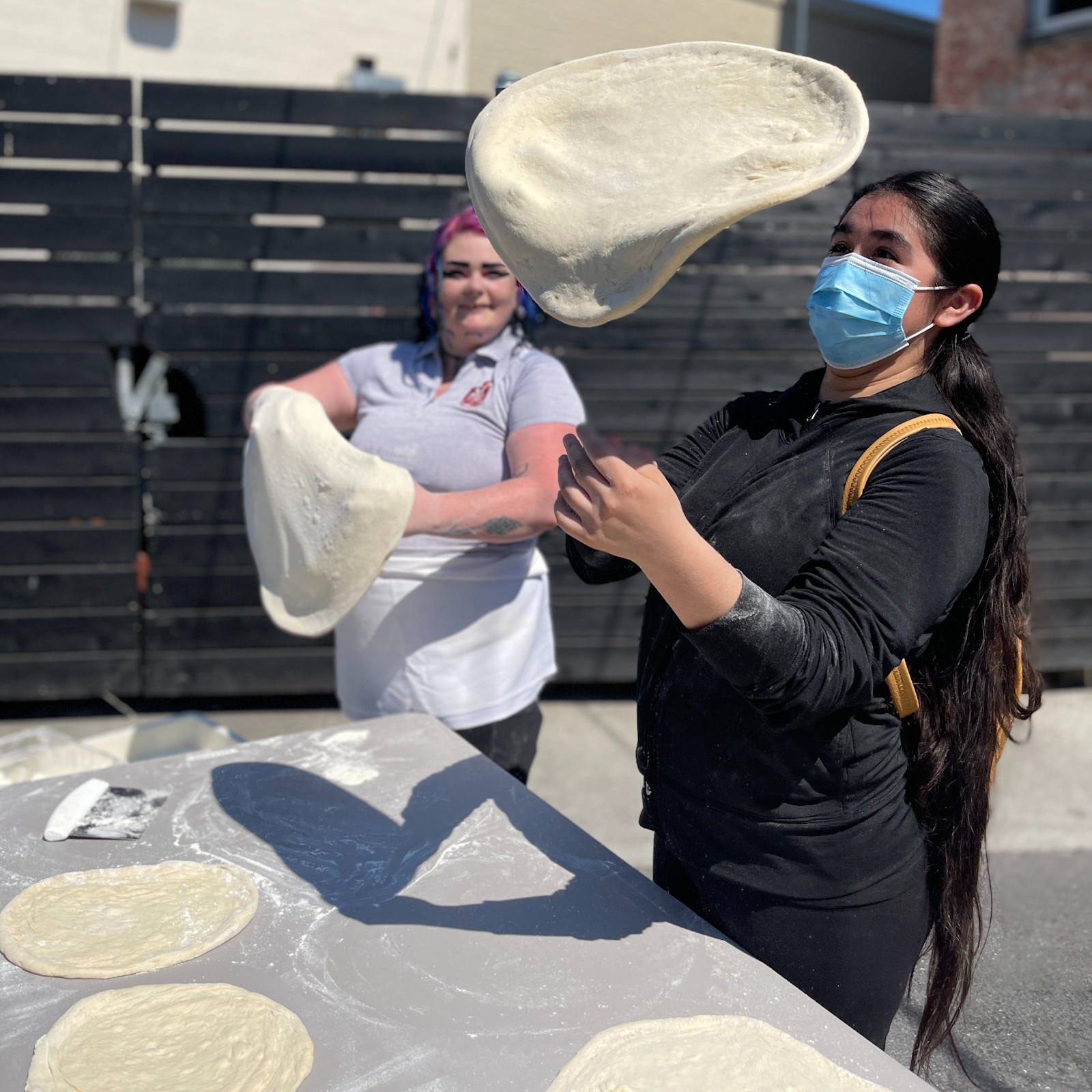 Several balls of pizza dough rest on a flour-topped table in the parking lot of the Columbia City Pagliacci Pizza. Jaylen Jones and Tre’vion Sinclair, two recent high school graduates, stand by their mentor, Stefan Hauser. Angela Agustin, Pagliacci’s Lead Inspector and a longtime trainer, encourages them by demonstrating the process. “Flatten it into a disc, like so,” she says. “Then toss it, flicking your wrist, almost like shooting a basketball.” With a few tosses, the dough spinning above her head, Angela lays down a nearly perfect sixteen-inch pizza crust just waiting for toppings.