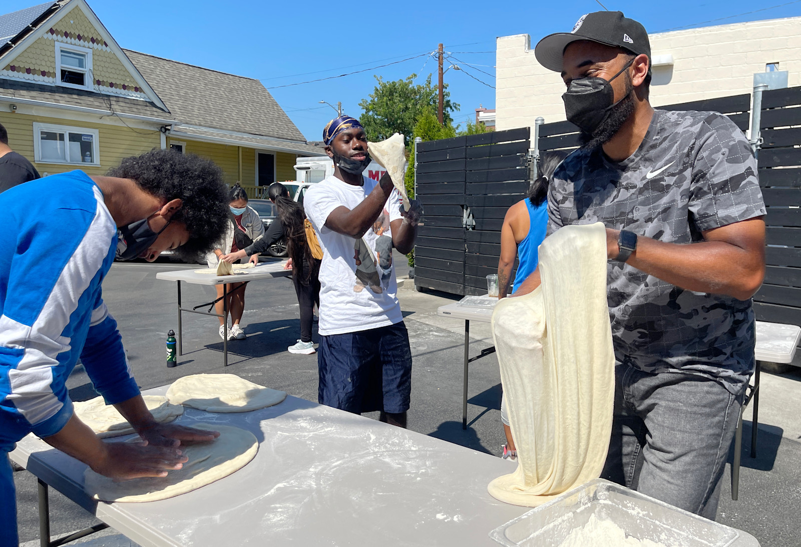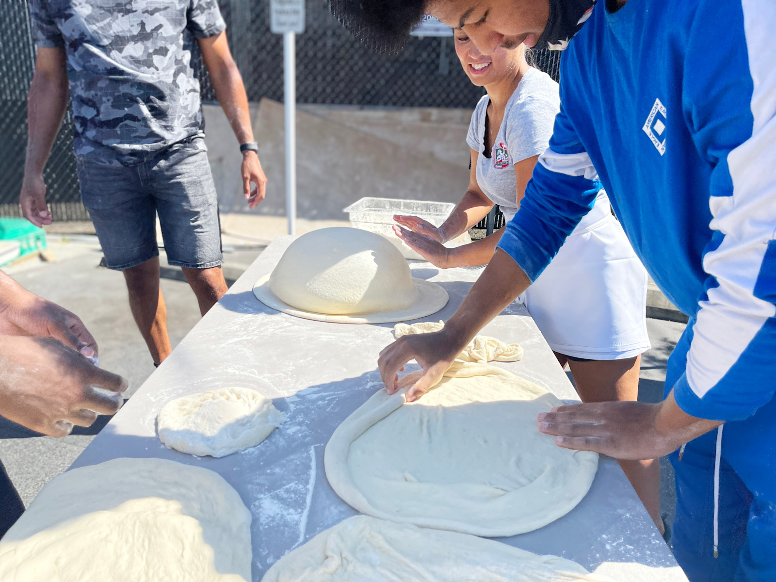 Soon, Jaylen, Tre’vion, and Stefan are tossing dough high in the air. The first few don’t go so well, and laughter ensues. But soon enough, a few serviceable results emerge. Stefan tosses what may be a good twenty-inch disc on the table, and it balloons up, almost a perfect half-sphere. “Gonna be hard to get the toppings to stay on that one,” he says.