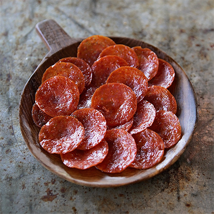Thinly sliced cured pork and beef sausage with a mild spicy flavor.