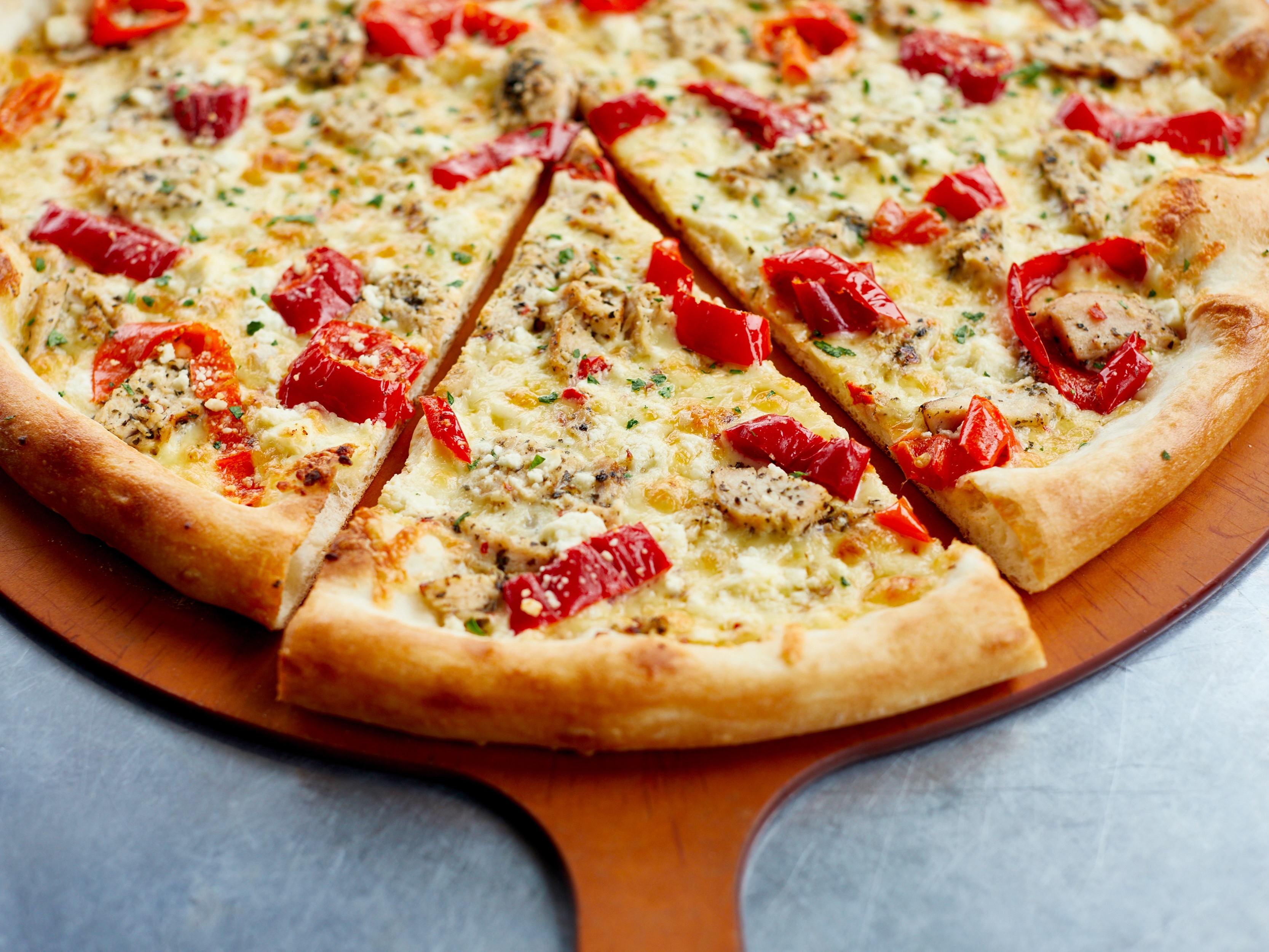 Pepperoni, salami, chicken, Mama Lil's peppers, olives and mozzarella on our seasoned tomato sauce.
